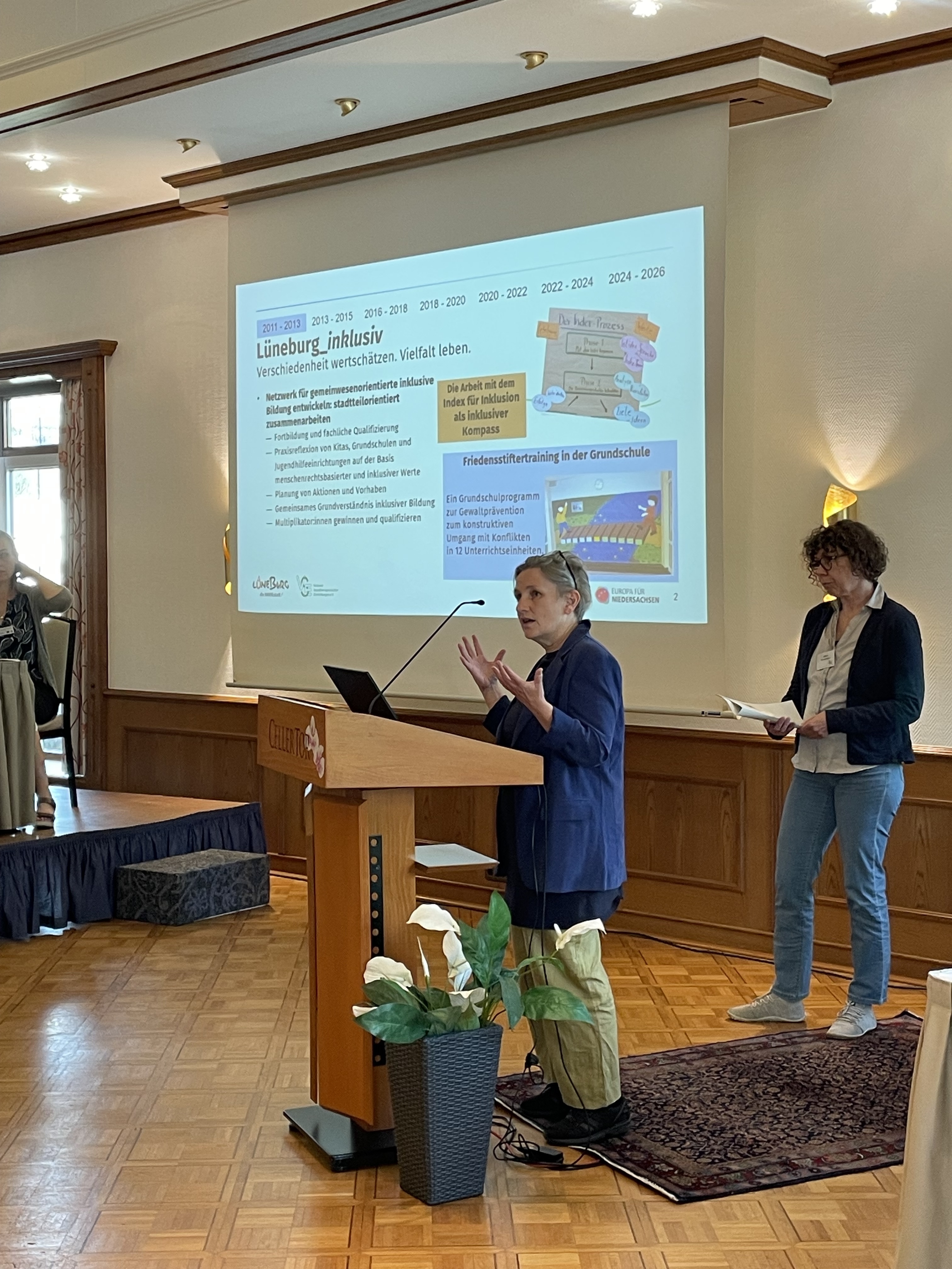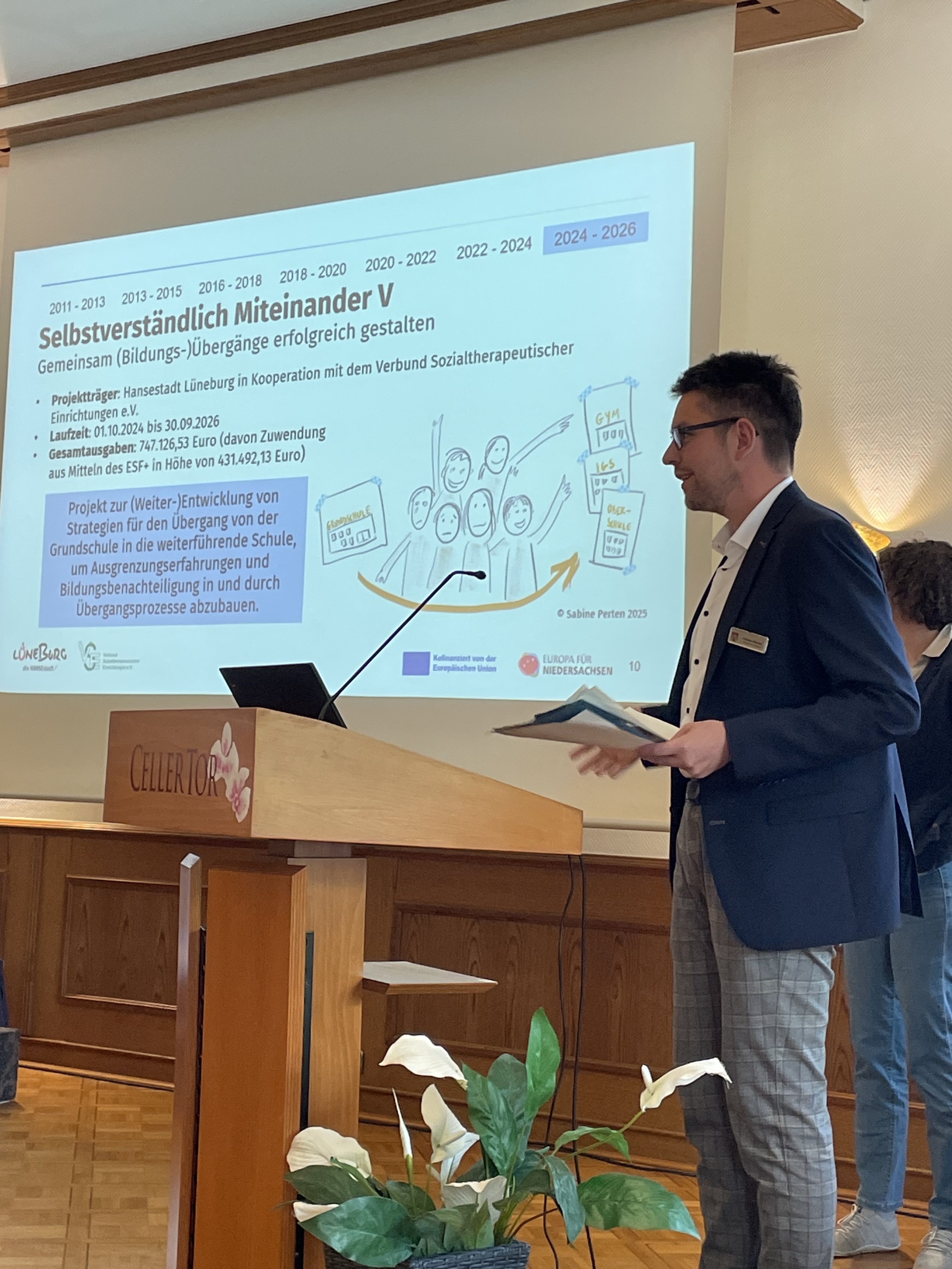 Am zweiten Tag stellte sich das Lüneburger Projekt „Selbstverständlich Miteinander V“ (gesprochen „Selbstverständlich Miteinander fünf“) dem Begleitausschuss vor. Selbstverständlich Miteinander V setzt auf der erfolgreichen Projektarbeit von über 10 Jahren auf und zeigt so, wie großes Engagement in Verbindung mit sinnvoller Förderung einen nachhaltigen Unterschied in der Region machen kann. Am Beginn stand 2011 ein Netzwerk für gemeinwesenorientierte inklusive Bildung, in dem die Partner in den letzten Jahren unterschiedliche Herausforderungen im Bereich Inklusion und Teilhabe adressiert haben. Das aktuelle Projekt will gemeinsam mit Schülerinnen und Schülern, Lehrkräften wie auch Eltern (Bildungs-)Übergänge z. B. zur weiterführenden Schule erfolgreich gestalten. Gefördert wird das Projekt der Hansestadt Lüneburg in Kooperation mit dem Verbund Sozialtherapeutischer Einrichtungen e.V. aus der Richtlinie „Inklusion durch Bildung und Teilhabe“ mit ca. 430.000 Euro aus dem ESF+.