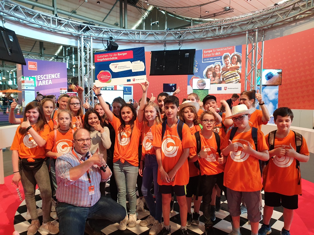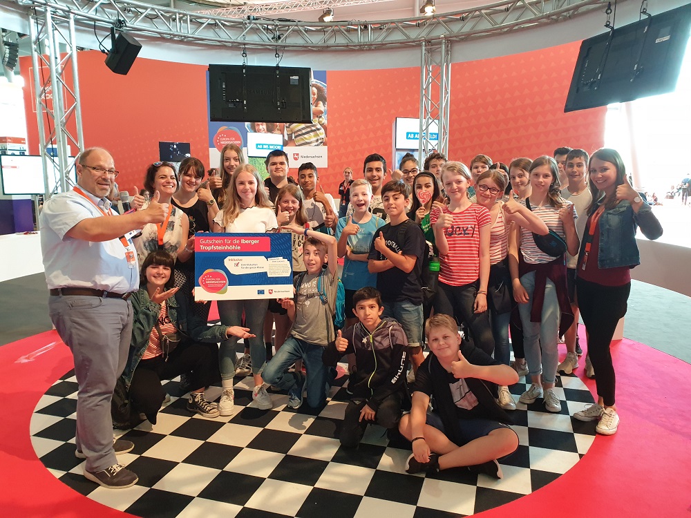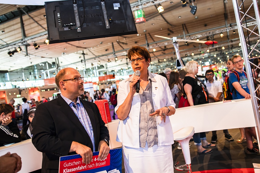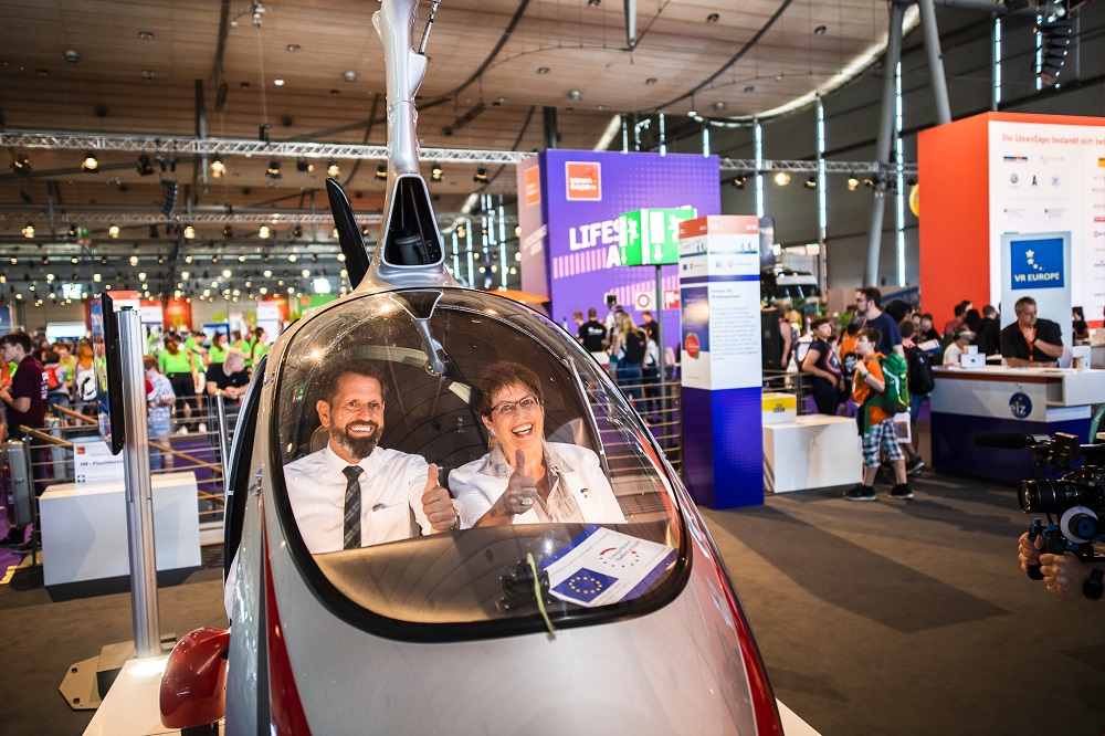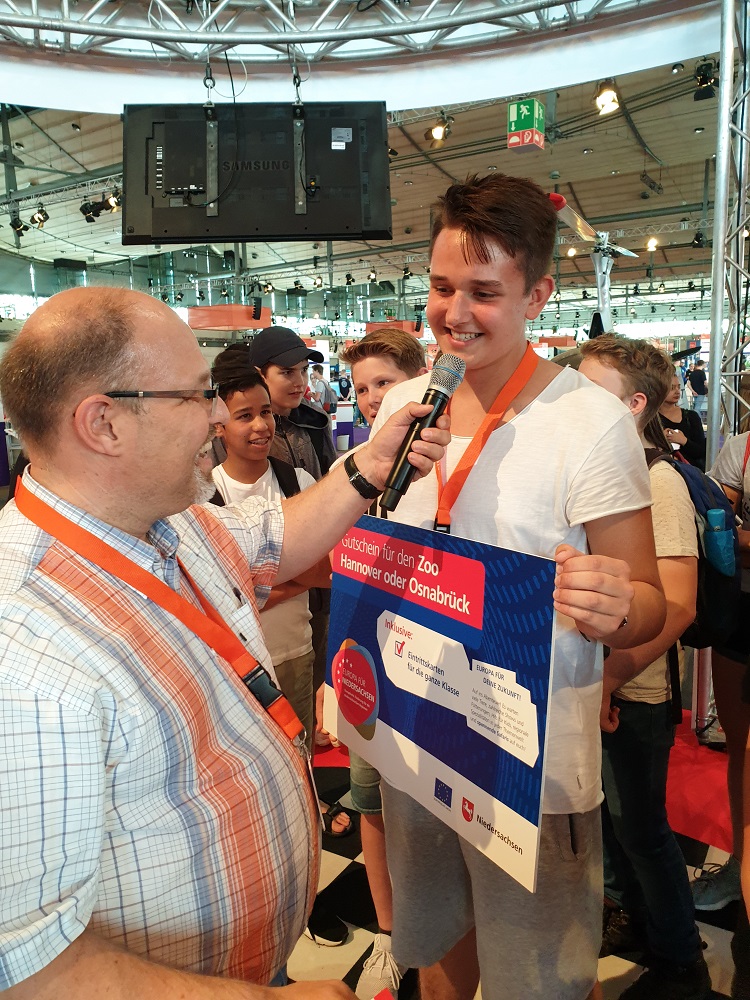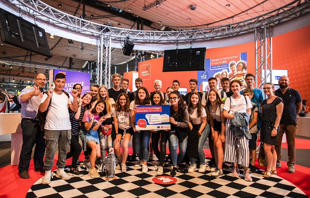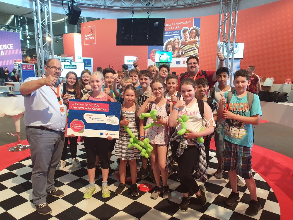 Auf der IdeenExpo 19 präsentierte das Europaministerium zusammen mit dem Landwirtschaftsministerium spannende EU-Projekte zum Anfassen und Abheben: Wer an den Stationen emsig Punkte sammelte, konnte hoffen, einen Freiflug in dem helikopterähnlichen Fluggerät zu gewinnen, eine eigene VR-Brille inkl. 360-Grad-Kamera oder einen Ausflug für die ganze Klasse. Am Ende jubelte die Klasse 8.2. des Julius-Spiegelberg-Gymnasiums Vechelde über eine Reise auf Europas Spuren nach Brüssel.
