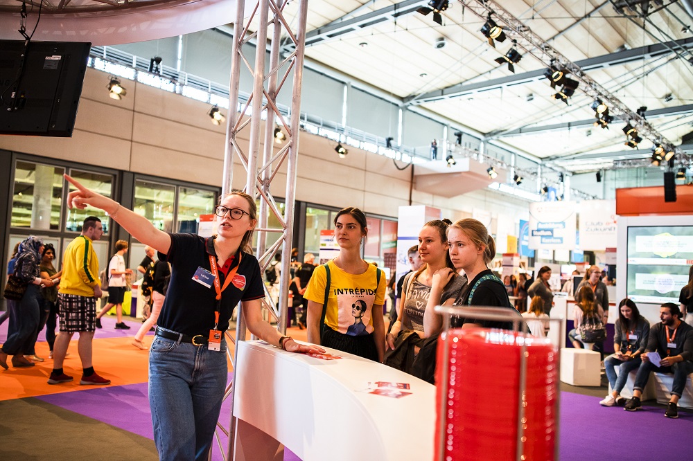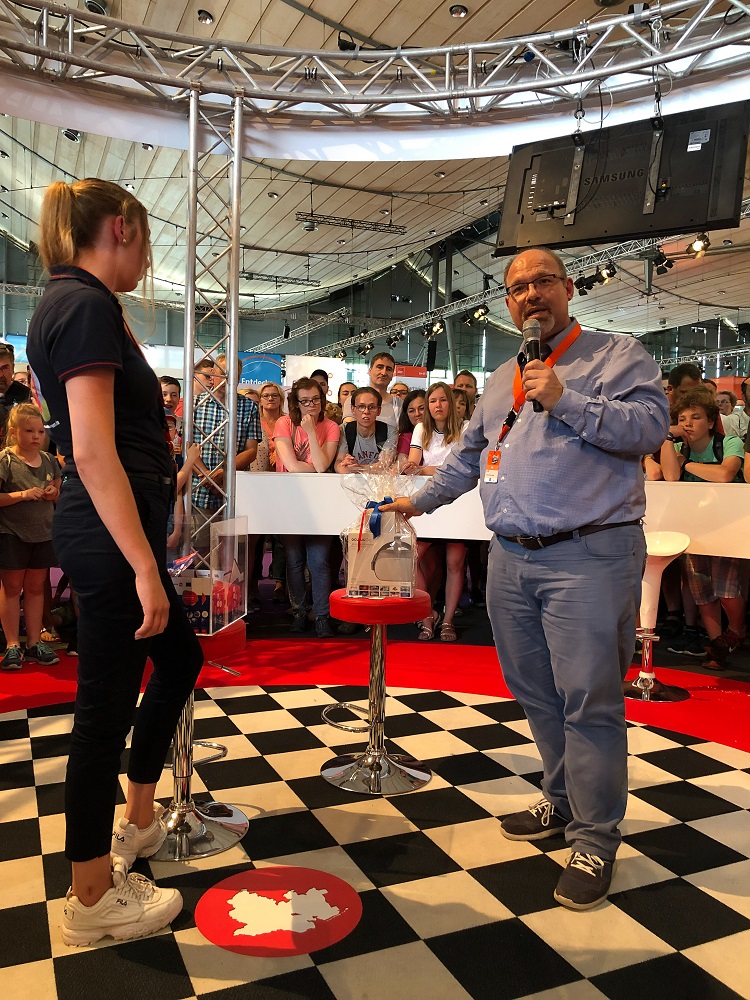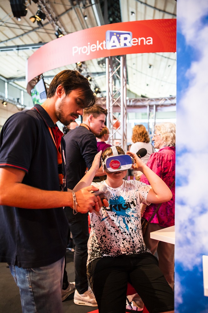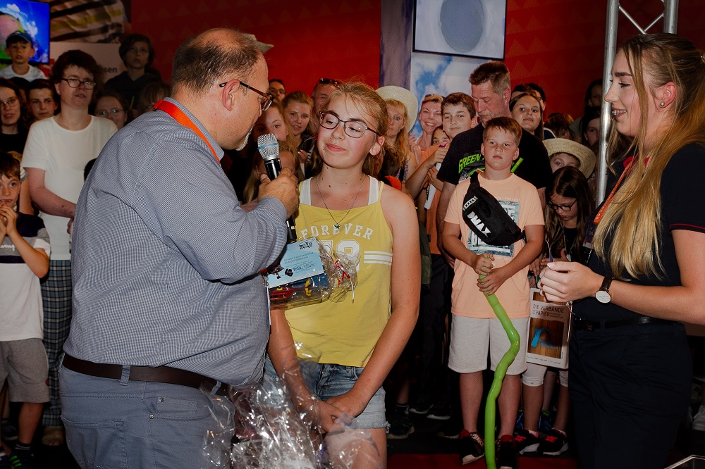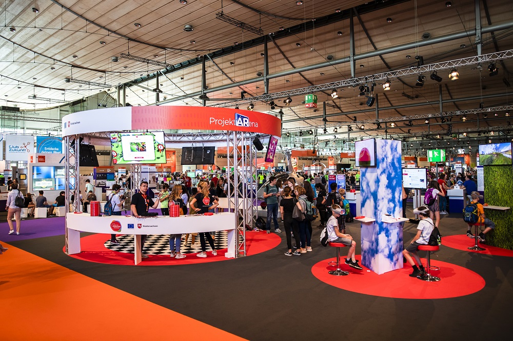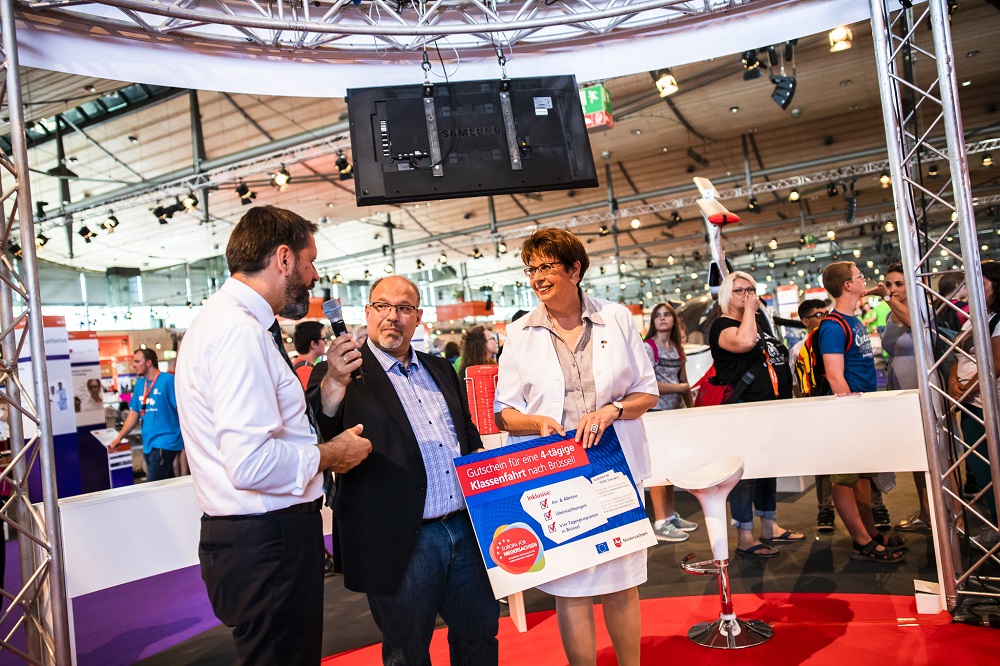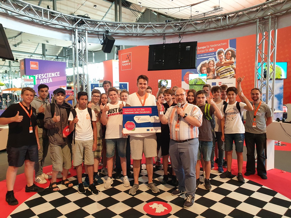 Auf der IdeenExpo 19 präsentierte das Europaministerium zusammen mit dem Landwirtschaftsministerium spannende EU-Projekte zum Anfassen und Abheben: Wer an den Stationen emsig Punkte sammelte, konnte hoffen, einen Freiflug in dem helikopterähnlichen Fluggerät zu gewinnen, eine eigene VR-Brille inkl. 360-Grad-Kamera oder einen Ausflug für die ganze Klasse. Am Ende jubelte die Klasse 8.2. des Julius-Spiegelberg-Gymnasiums Vechelde über eine Reise auf Europas Spuren nach Brüssel.