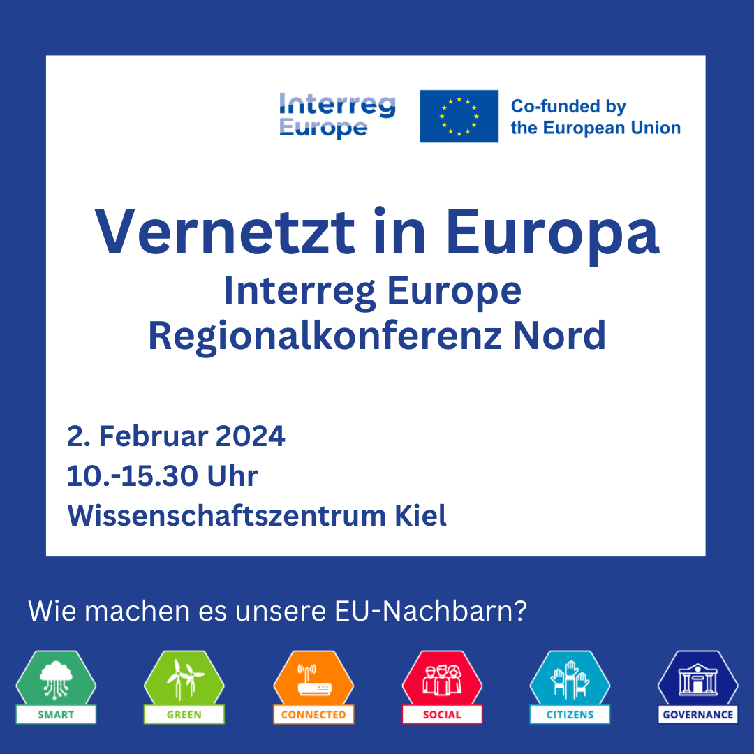 Am 2. Februar 2024 laden Bremen, Hamburg, Niedersachsen und Schleswig-Holstein alle Interessierten nach Kiel zur Interreg Europe Regionalkonferenz VERNETZT IN EUROPA ein, um sich umfassend zum Programm zu informieren, Projektinteressierte zu treffen und Ideen gemeinsam weiterzudenken. Die Veranstaltung dient auch zur Vorbereitung auf den kommenden 3. Förderaufruf (Call), der am 20. März 2024 starten wird.